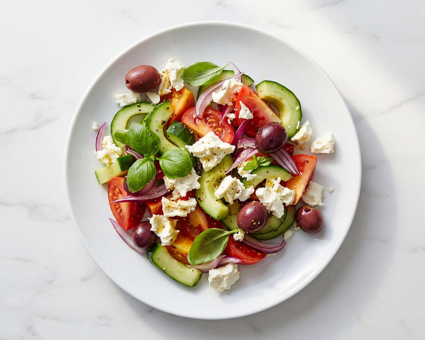 Traditional Greek salad, known as Horiatiki or Greek village salad, is commonly served in Greece from early spring through early fall. It highlights fresh seasonal produce such as juicy tomatoes, cucumbers, green bell peppers, and onions.